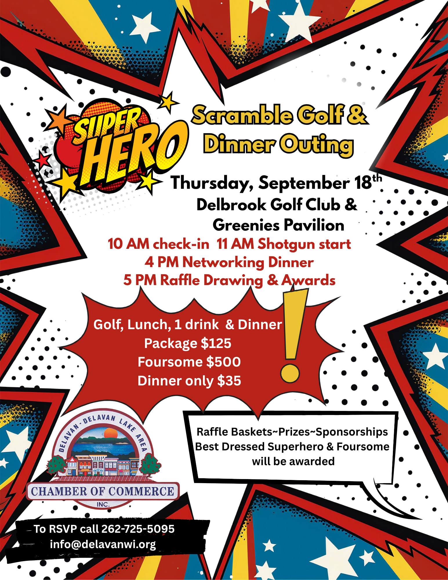 Grab your Cape and Mask "FOUR" the SUPER HERO Scramble Golf Outing September 18th at Delbrook Golf Club in Delavan. Sign up your SUPER FRIENDS for Golf, Dinner OR BOTH. We are gladly accepting RAFFLE Basket donation for the 32nd annual outing for a Delavan-Delavan Lake Area Chamber of Commerce. Come enjoy a fantastic day of Networking!