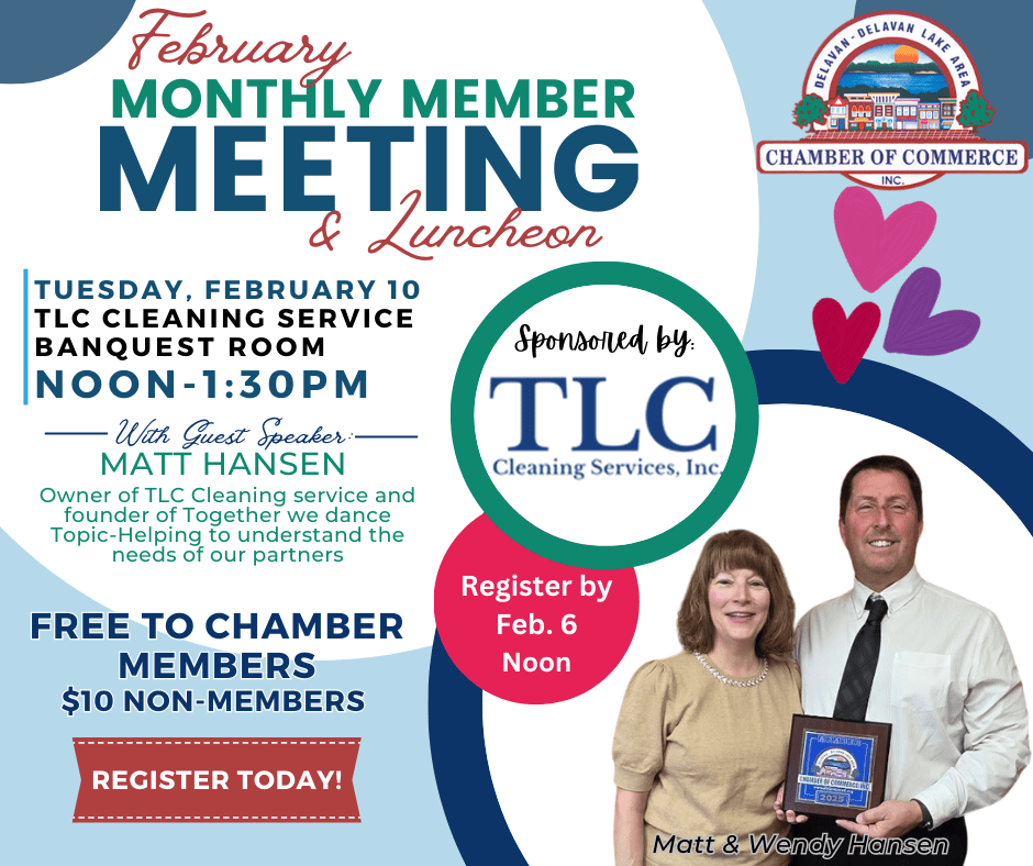 Join us for the Delavan Chamber monthly member lunch meeting on Tuesday February 10th from 12:00pm - 1:30pm. Our meeting is hosted and the meal is sponsored by Wendy and Matt Hansen owners of TLC Cleaning Services in Elkhorn. Our special guest speaker is Matt Hansen who is also the founder of Together we Dance. The topic for the day is helping to understand the needs of our partners.