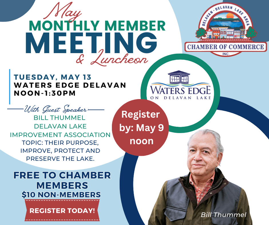 Monthly Members Lunch Meeting Tuesday May 13, 2025, Hosted by Waters Edge and Sponsored by The Delavan Lake Improvement Association. Celebrations on Wells will be catering the lunch.