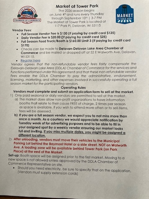 Attention Market Vendors: This year's market will be 15 weeks long from June 4 through September 10 running from 3 PM-7 PM every Thursday. The investment for the season is $130. That is an investment of $8.66 per week. If you cannot commit to the full season, we do offer a daily fee option at $20 per week. If you pay by credit card there is a slight up charge to cover the cc service fees. The Chamber tent will again be serving beverages. We kindly ask that you do not offer soda or water at your booth. Our beverage sales help pay for market costs including the live music from 5-7. If you have any questions, please reach out to the market managers, Malinda Obershaw or Monica Damrow at the Delavan Chamber office 262-728-5095.