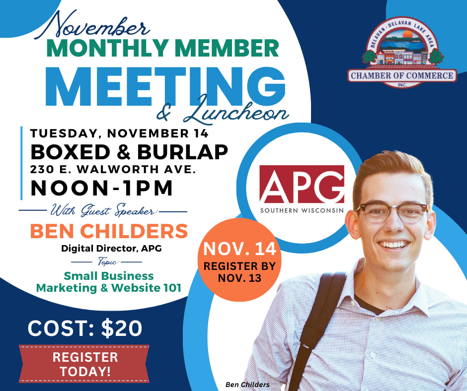 November's Chamber Member lunch meeting at Boxed & Burlap, Downtown Delavan. 12:00 pm - 1:30 pm. Learn about small business marketing and website 101 from Ben Childers, Digital Director with Adams Publishing Group.