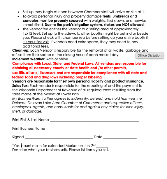 Attention Market Vendors: This year's market will be 15 weeks long from June 4 through September 10 running from 3 PM-7 PM every Thursday. The investment for the season is $130. That is an investment of $8.66 per week. If you cannot commit to the full season, we do offer a daily fee option at $20 per week. If you pay by credit card there is a slight up charge to cover the cc service fees. The Chamber tent will again be serving beverages. We kindly ask that you do not offer soda or water at your booth. Our beverage sales help pay for market costs including the live music from 5-7. If you have any questions, please reach out to the market managers, Malinda Obershaw & Monica Damrow at the Delavan Chamber office 262-728-5095 | info@delavanwi.org