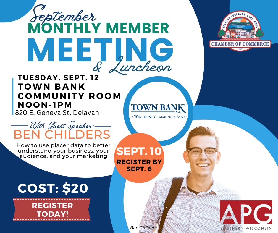 Chamber Member Lunch Meeting 12-1:30 at the Town Bank Community Center room located at 820 E. Geneva St, Delavan. The Guest Speaker and Chamber Member, Ben Childers Digital Manager from APG and Local Matters Digital will be speaking on: How to use placer data to better understand your business, your audience, and your marketing. We will enjoy a catered lunch by Arandas Mexican Grill.